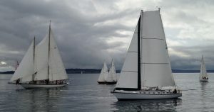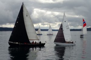 Observation from Fort Worden an hour after the start showed the fleet flying rather limp spinnakers to a light Southeasterly in Admiralty Inlet but after passing Pt Wilson the current became stronger than the wind and boats were carried West until they could clear the wind shadow of the bluffs. Challenging conditions.