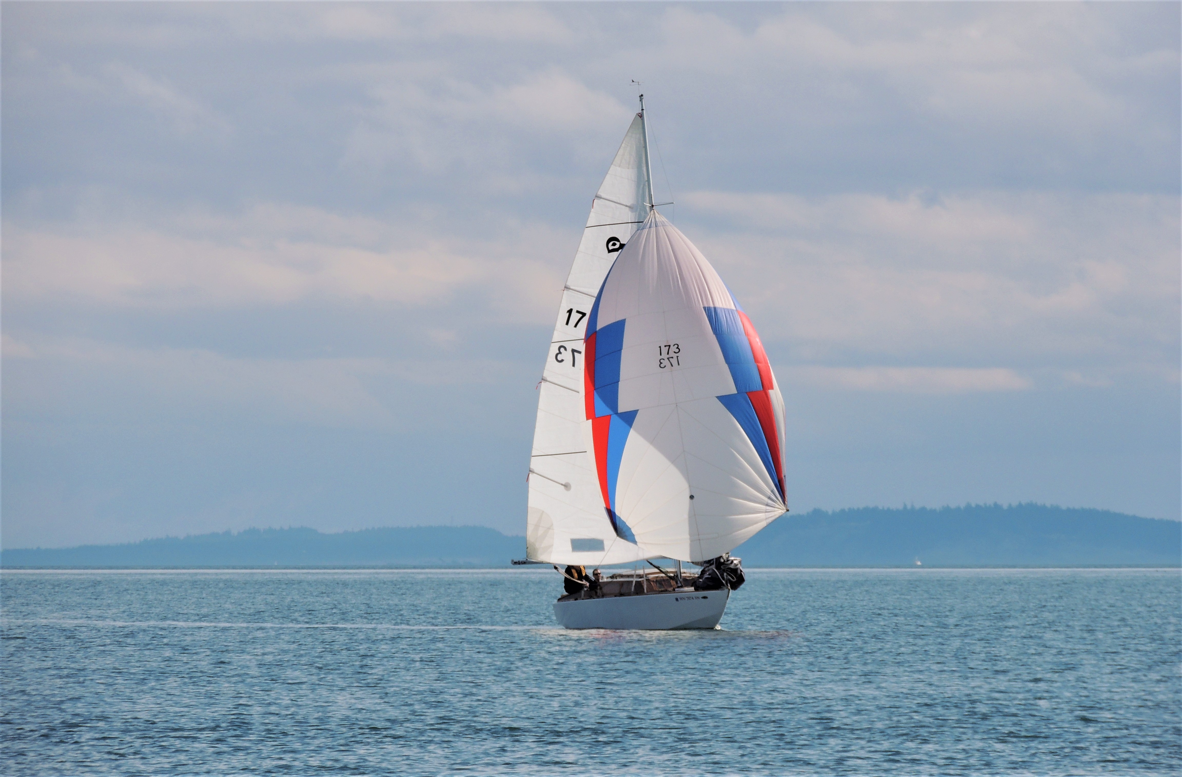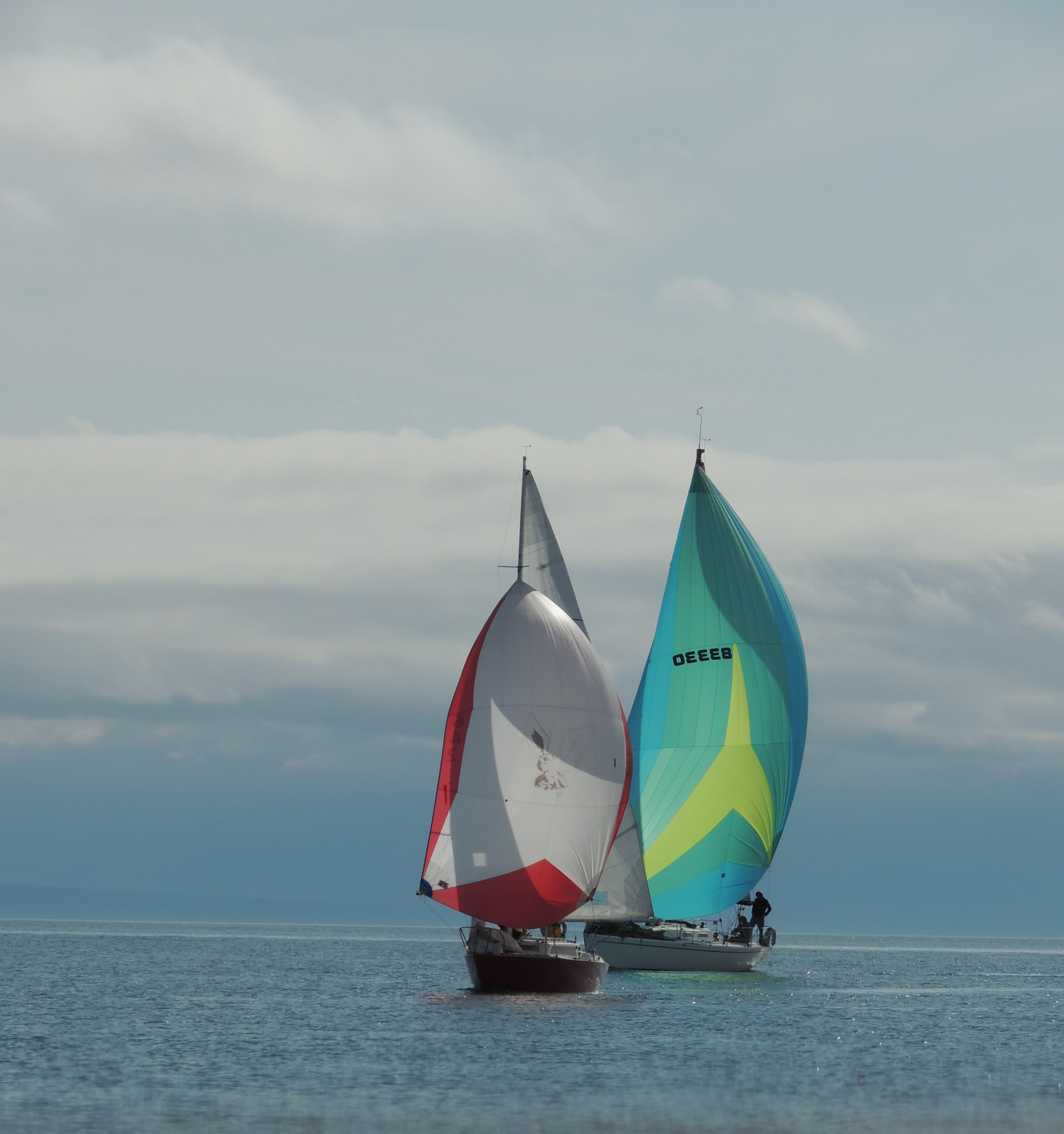 Strange but true, we sailed upwind with our symmetrical spinnaker for most of the race. The sun was shining and warm (I have a sun burn on my face to prove it), sea birds were in abundance, there were several porpoise sightings, and possibly a whale sighting too. We rounded clockwise and met several of the other boats rounding on the east side of Minor. A significance difference from last year was that nearly the entire fleet converged on the east side of Minor Is. at the same time. Having rounded from the west,  we tacked twice on our return leg and were able to lay the Pt. Hudson buoy in one long tack. The current, for us, was favorable the entire way.