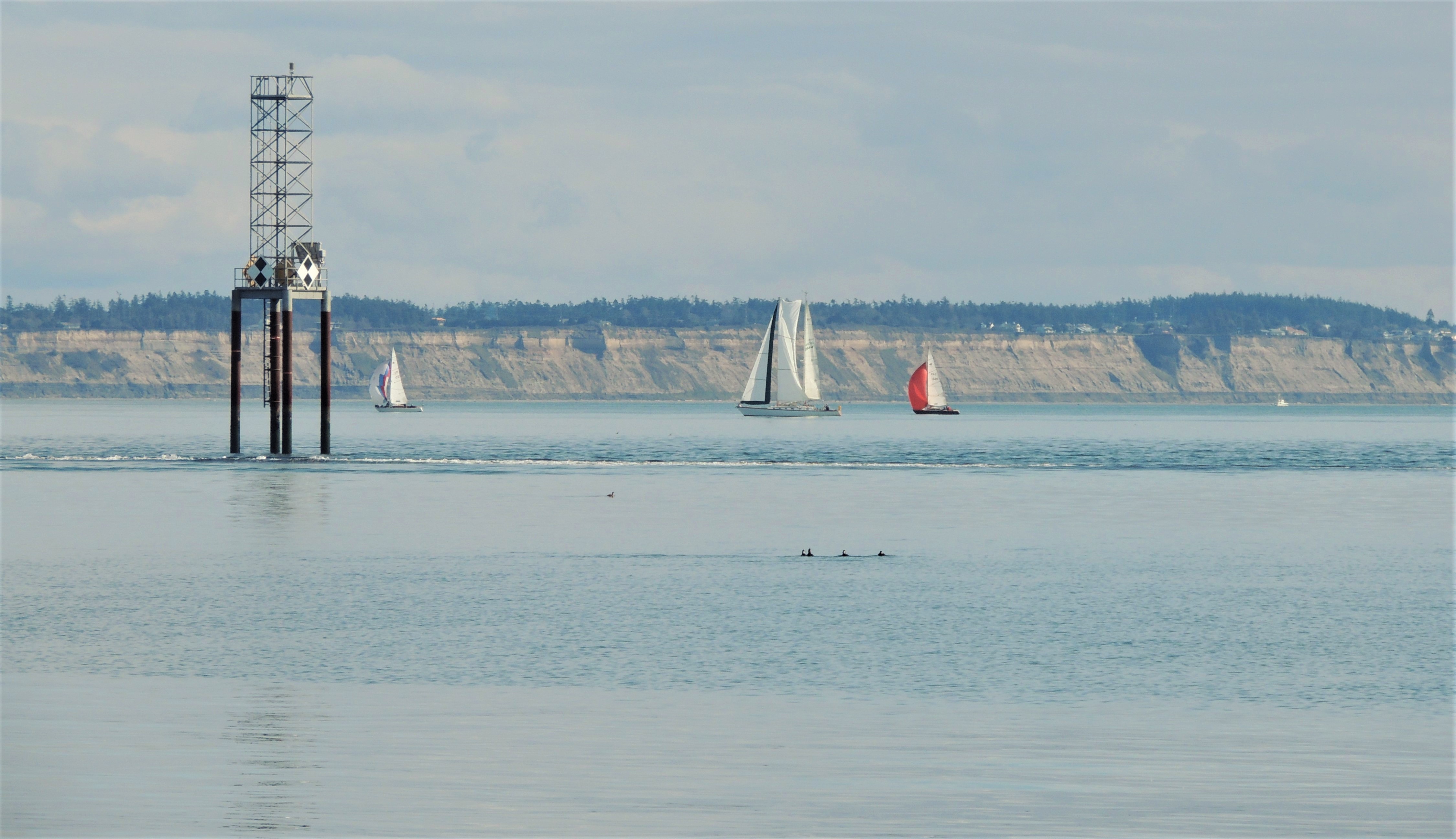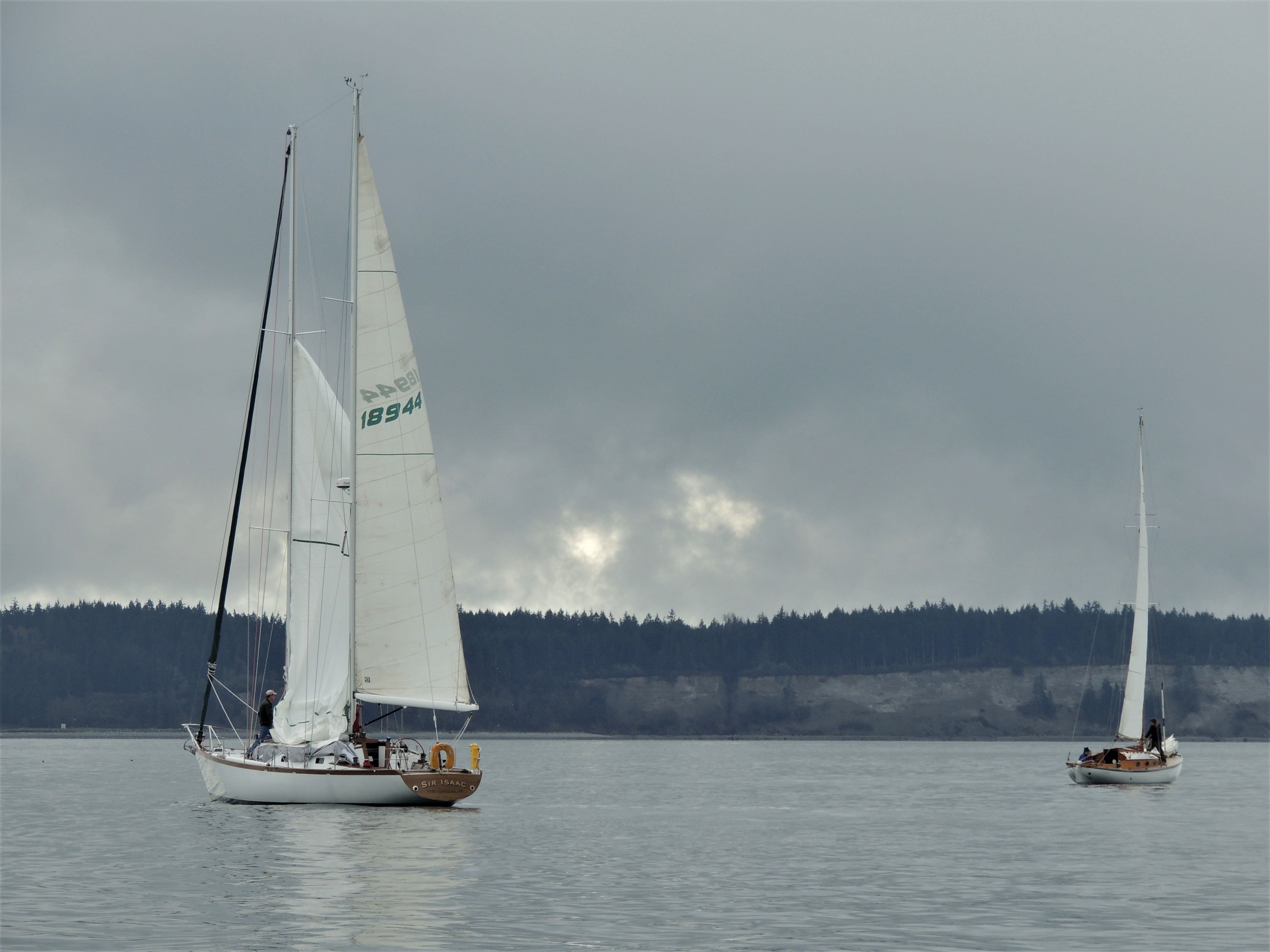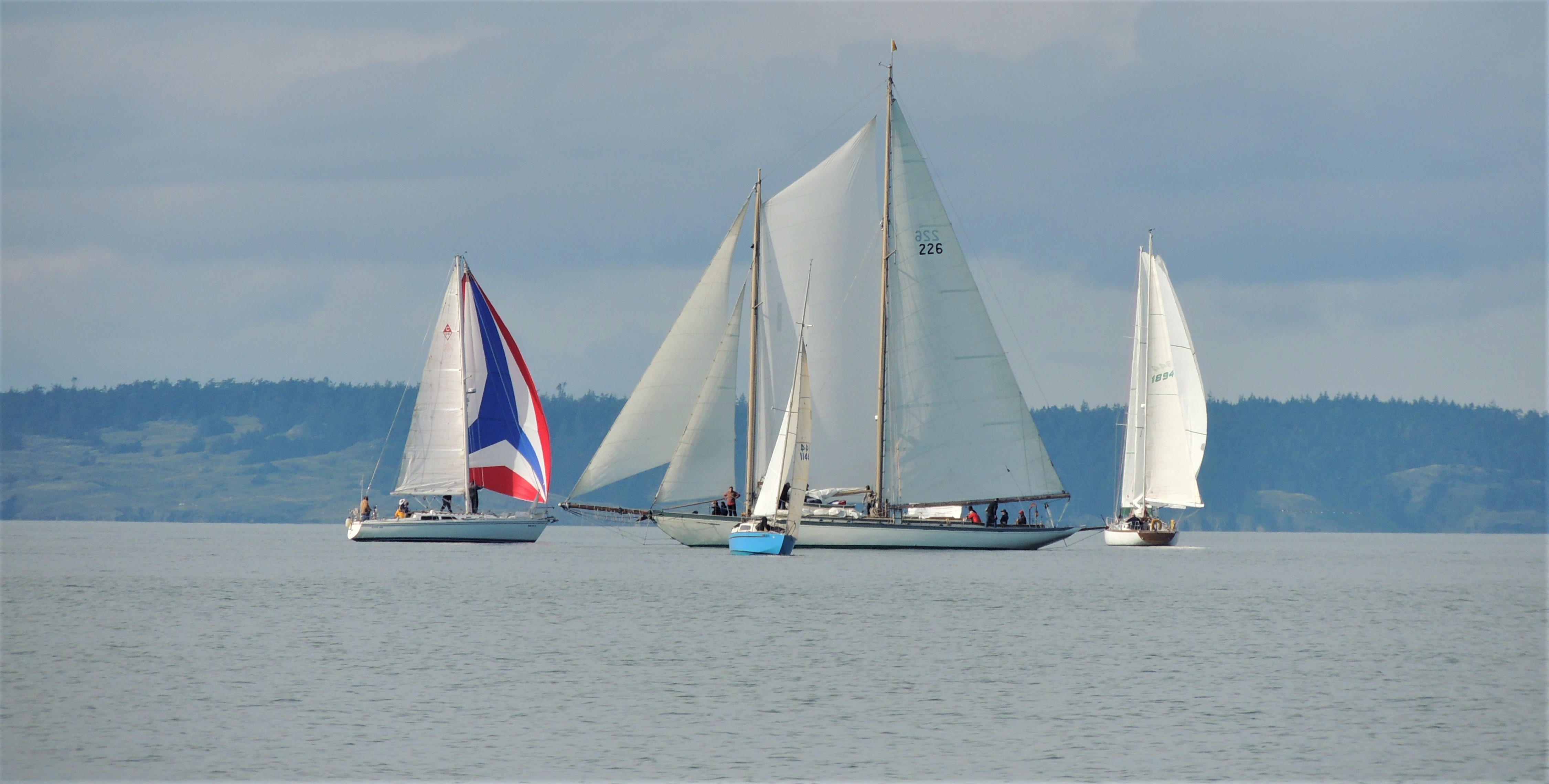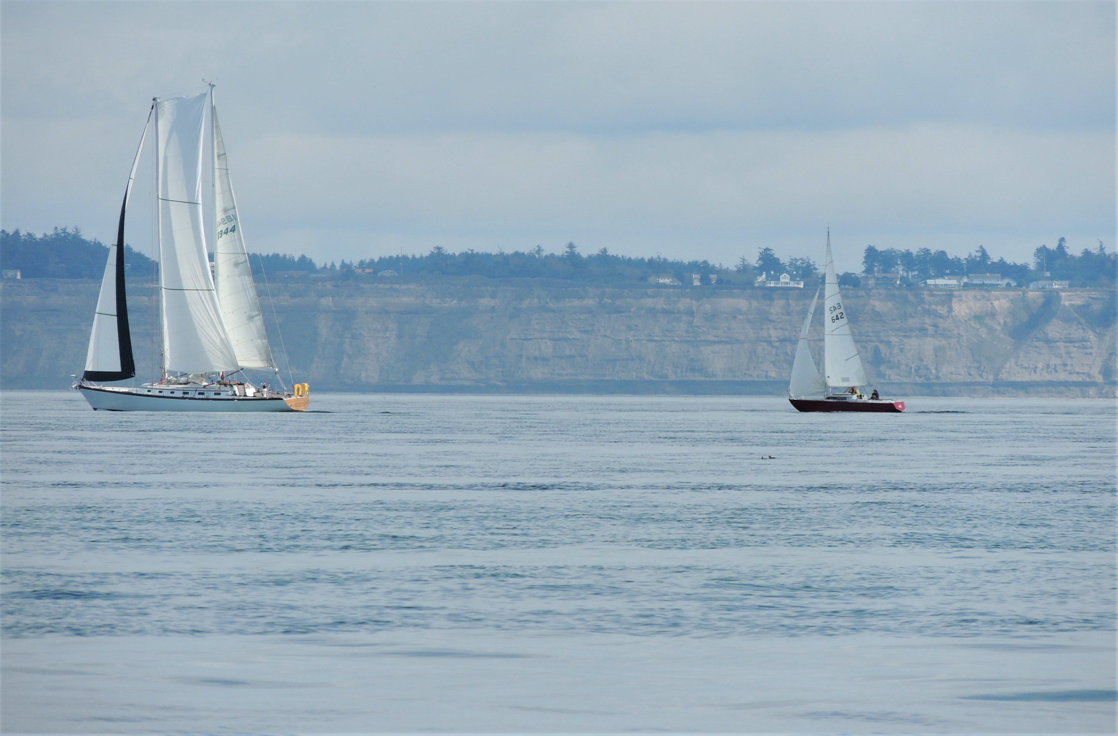 Observation from Fort Worden an hour after the start showed the fleet flying rather limp spinnakers to a light Southeasterly in Admiralty Inlet but after passing Pt Wilson the current became stronger than the wind and boats were carried West until they could clear the wind shadow of the bluffs. Challenging conditions.
