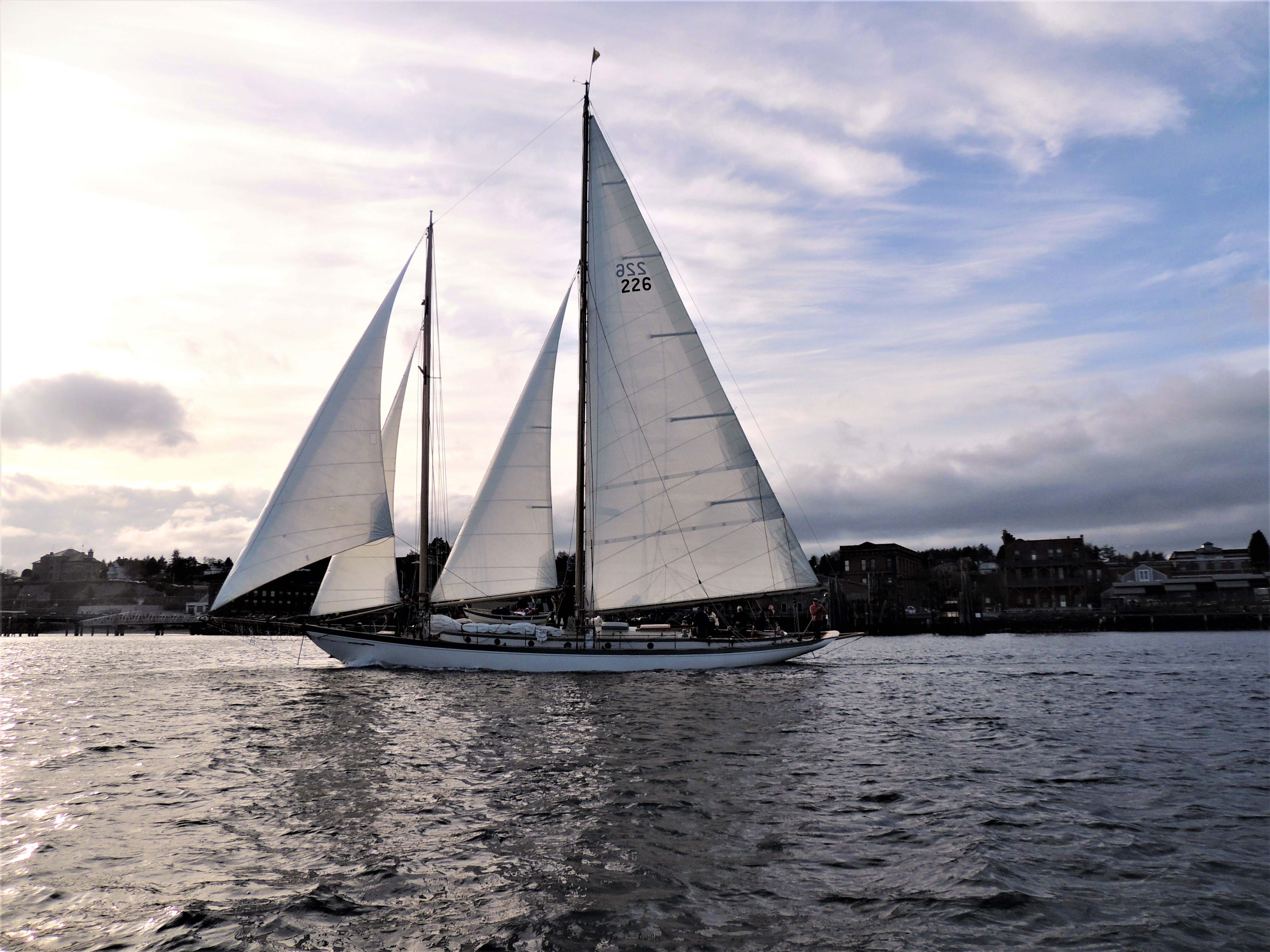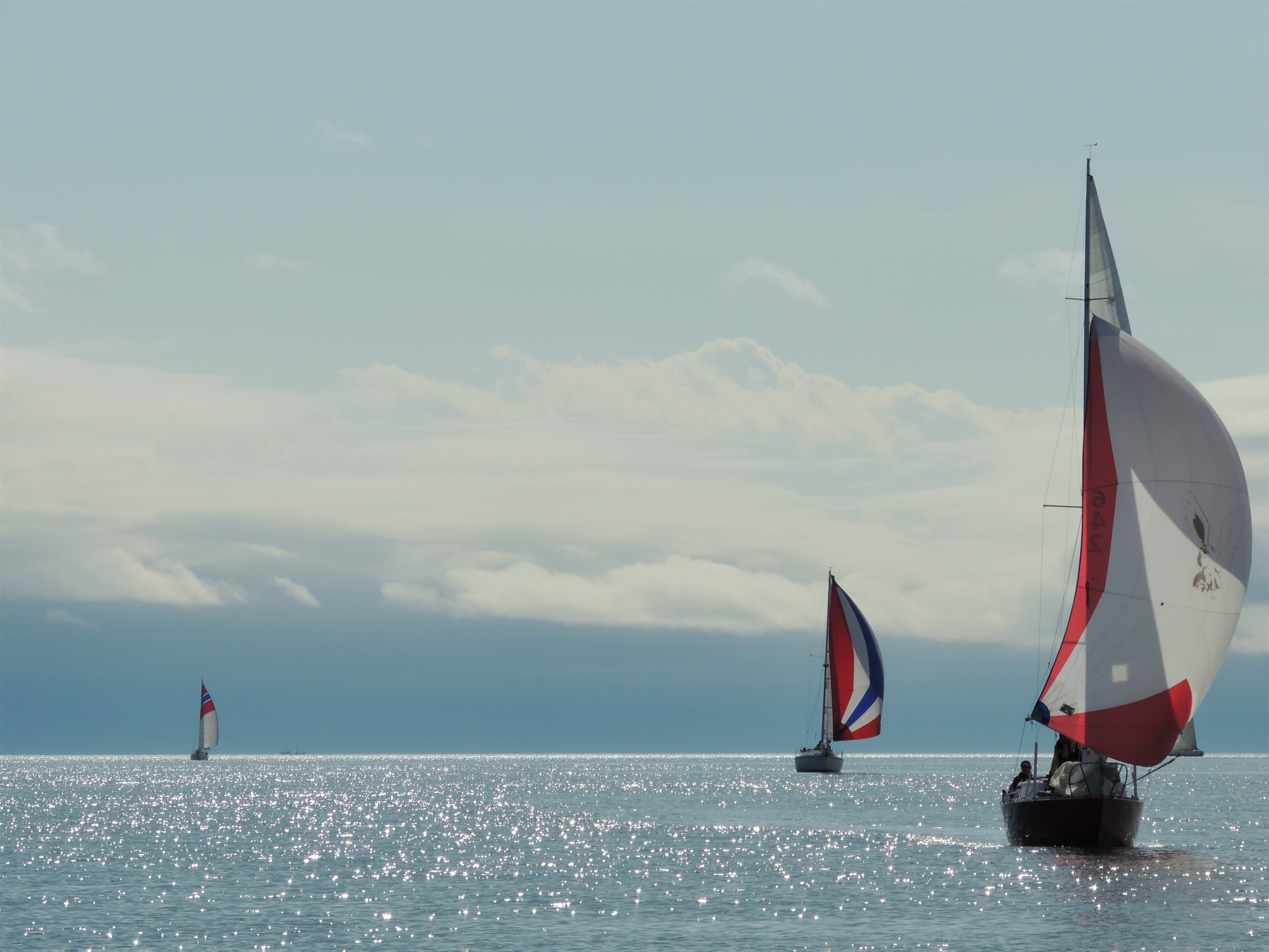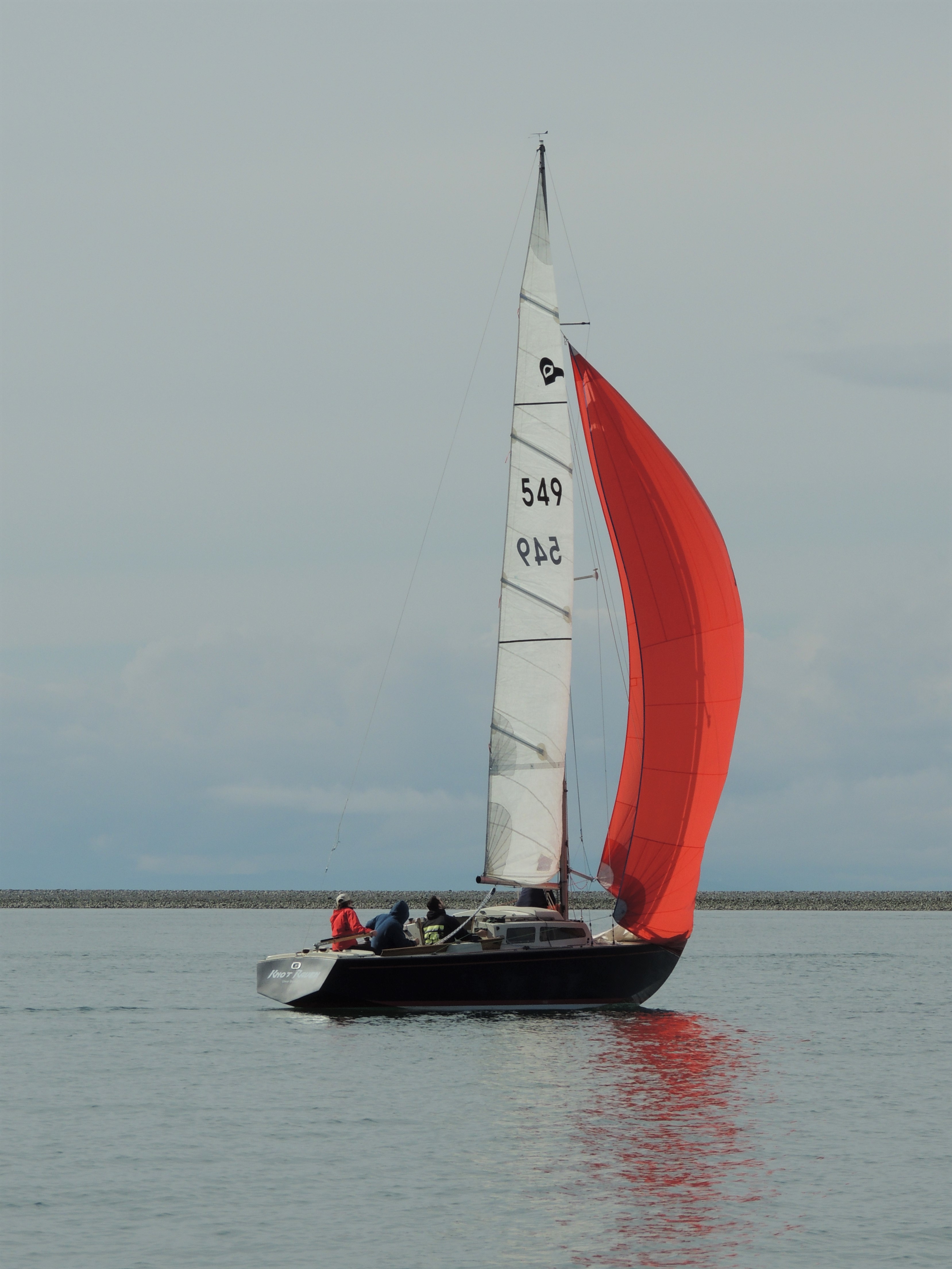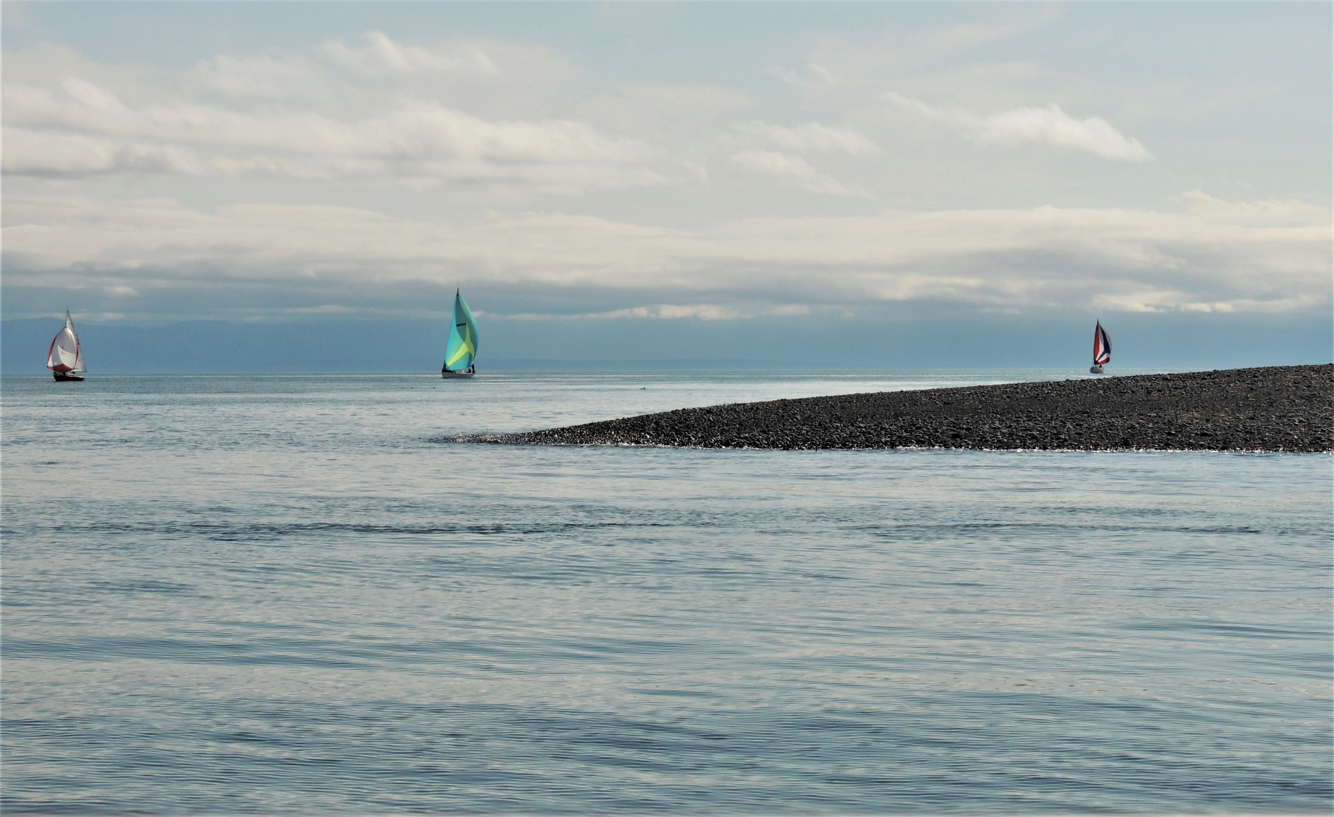 Following a blustery week, and faced with a Gale Warning, the twelve boats reporting for the start found very light winds and calm seas. As race time approached long scans of the surface showed no dark patches to indicate wind. The very light NE draft was not enough to register on the RC anemometer. However the fleet was demonstrating steerage-way, although barely stemming the current by the pier, so there was nothing to be gained by a postponement and the start was on time.