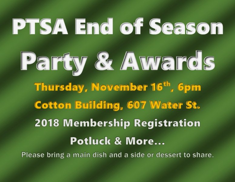 The PTSA racing season has come to a close, but we’re not quite done yet! The end of season party will be on Thursday, November 16th, 2017 at 6pm. This year it is being held at the Cotton Buidling on Water Street (NOT at the Maritime Center). Like last year it will be a pot luck. Please bring a main dish and a side or dessert to share.