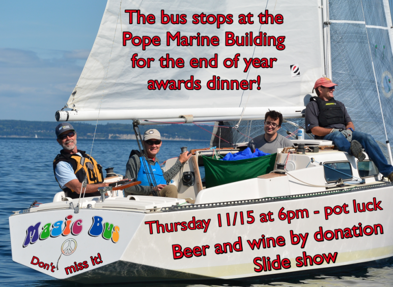 The annual end-of-the-year awards party and dinner will be held at the Pope Marine Building at 6pm on Thursday 11/15 at 6pm. As in the past it will be a potluck dinner – please bring a main and a side dish to share. Beer and wine will be available and there will be a slideshow. This is always a fun event that provides an opportunity for each crew to relive their victories and decry their losses, to retell the stores of crashes and near misses, and to get excited for the new season starting in the spring of 2019.
