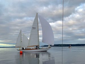 This was yet another drifter, but much better attended than last week. The wind was steadily from 350°M which made C & G the only usable W/L permanent marks. The CB set the S/F line between them near the middle of the bay where the wind was strongest, at 2 – 3 kts., occasionally 4+. Course SCFGF was posted which allowed for shortening course on the downwind leg. The wind became increasingly light and fluky as the fleet approached C and then, except for the odd cat’s paw, died. There was still a little wind at the CB, enough to fill the Chutes of those who managed to reach it. The course was shortened, to 1.44 nm., at the CB but only four boats managed to cross the line within the time limit (the fourth was exactly, to the second, 20 mins. behind the first). The rest were not even close or had given up trying.