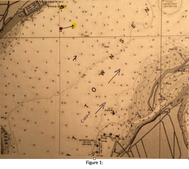 The conventional wisdom I’ve heard from local sailors is that the ebb current flows most strongly along the deeper channel marked by the 10-fathom line on the NOAA chart for Port Townsend Bay. That sounds plausible and is consistent with what we observed on the racecourse on Saturday. If, in fact, the ebbing current on Saturday flowed more strongly along the 15-fathom channel east of the 10-fathom line, past the green lighted buoy #1, what impact would this have had on the race?