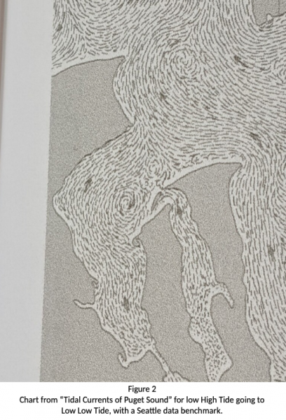 Current data is not readily available for Port Townsend Bay. There is a “toilet bowl” effect, says Jeff Brantley. He directed me to “Tidal Currents of Puget Sound” by Starpath publications, which reproduces tide charts for Port Townsend Bay from 1977 data. It is not a state-of-the-art product. Jeff pulled out the chart below as most relevant to our tide conditions on Saturday. This chart is not consistent with the NOAA data of three knots current flowing out of the Port Townsend canal. The Starpath chart “does show a very distinct flow still coming into the Bay along the Rat Island + Indian Island shore,” said Jeff. “However, its’s not exactly what we saw on the water as there was definitely outbound water at the green buoy,” he noted.