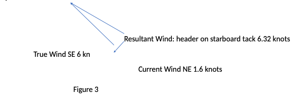 If a boat sails on starboard tack in the above 6 knot SE True Wind, from an area of no current, into an area of 1.6 knots of current as shown above in Figure 3, it will experience a header of approximately 18 degrees, and an increase in wind strength of .32 knots. Owl and Raven, by having sailed towards this wind shift, found themselves upwind and inside of the shift in a stronger breeze—as we wish to be, and they were able to cross Falcon and Kuma San by coming back on port tack in this new Resultant Wind.