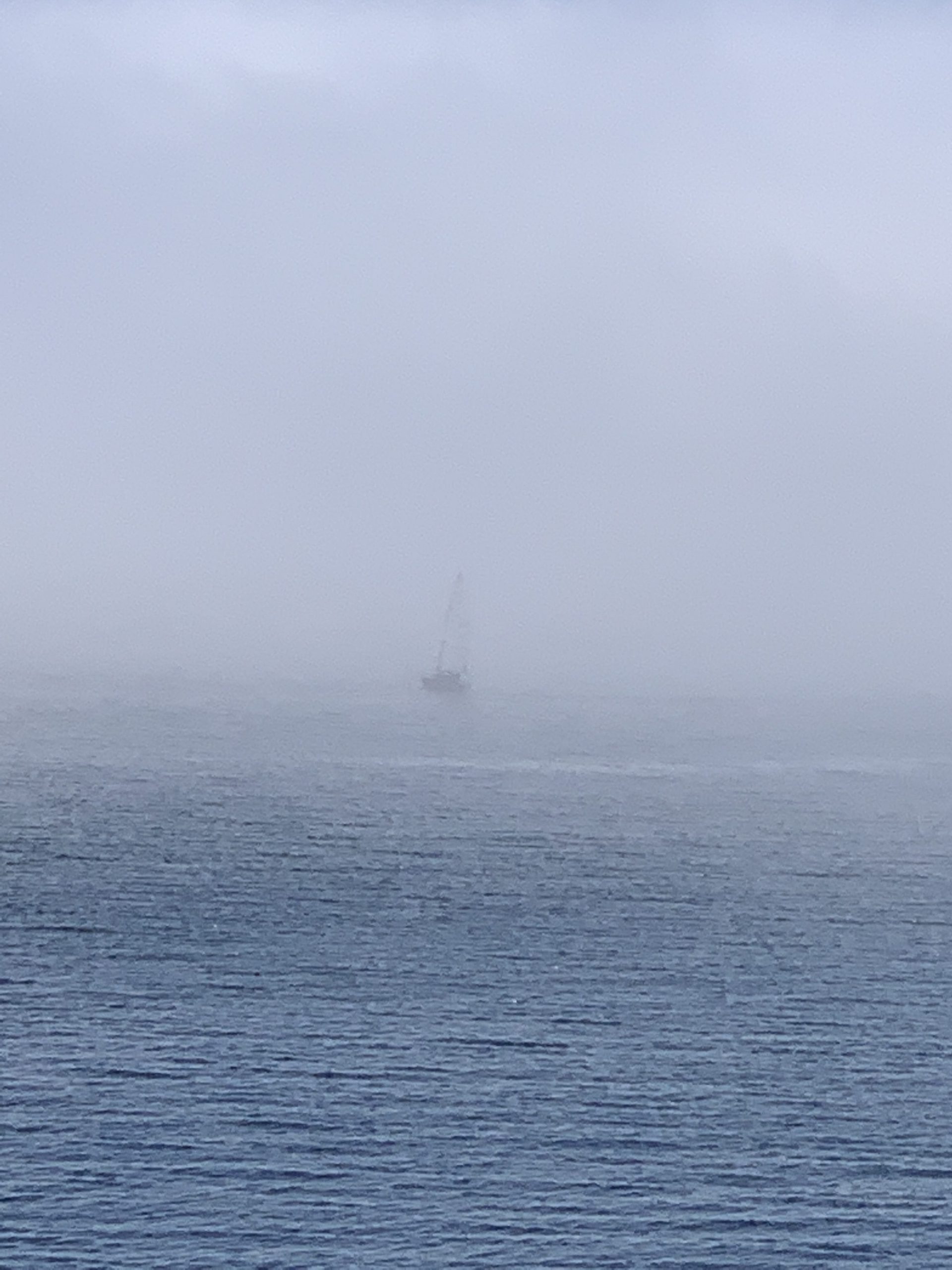 Vamoose went around the wrong side of the PT Wilson buoy and DSQ’d herself. Will read better someday…..Withdrew about a mile from Protection Is. with the F31 lurking nearby in the lifting fog.