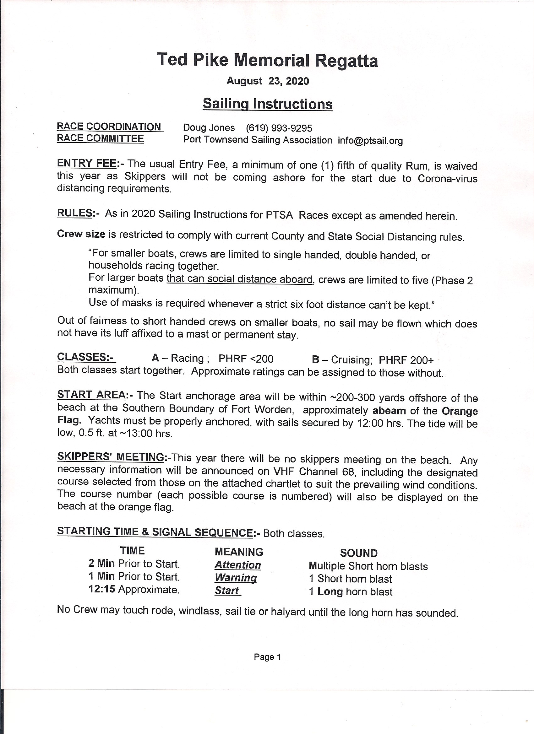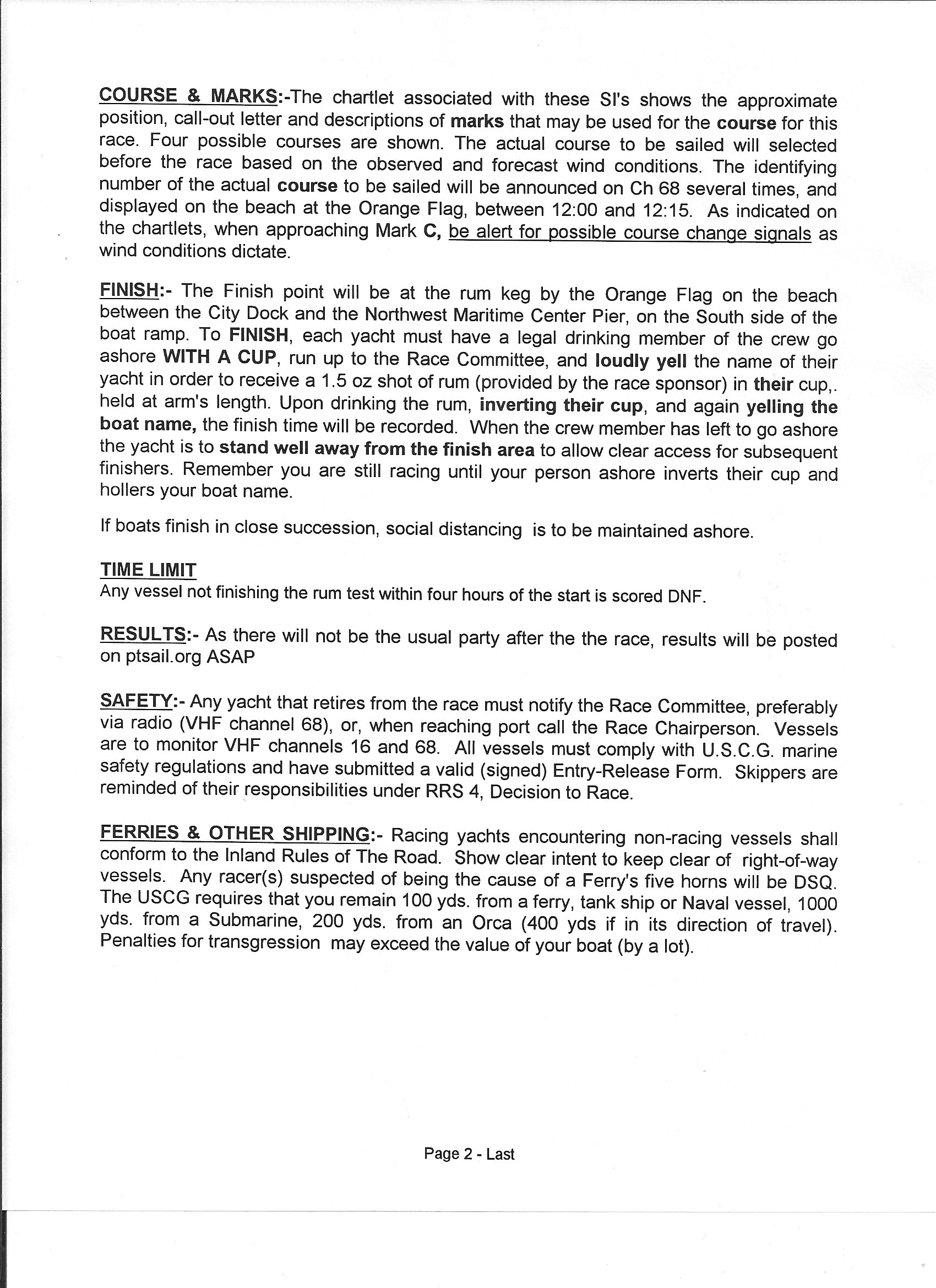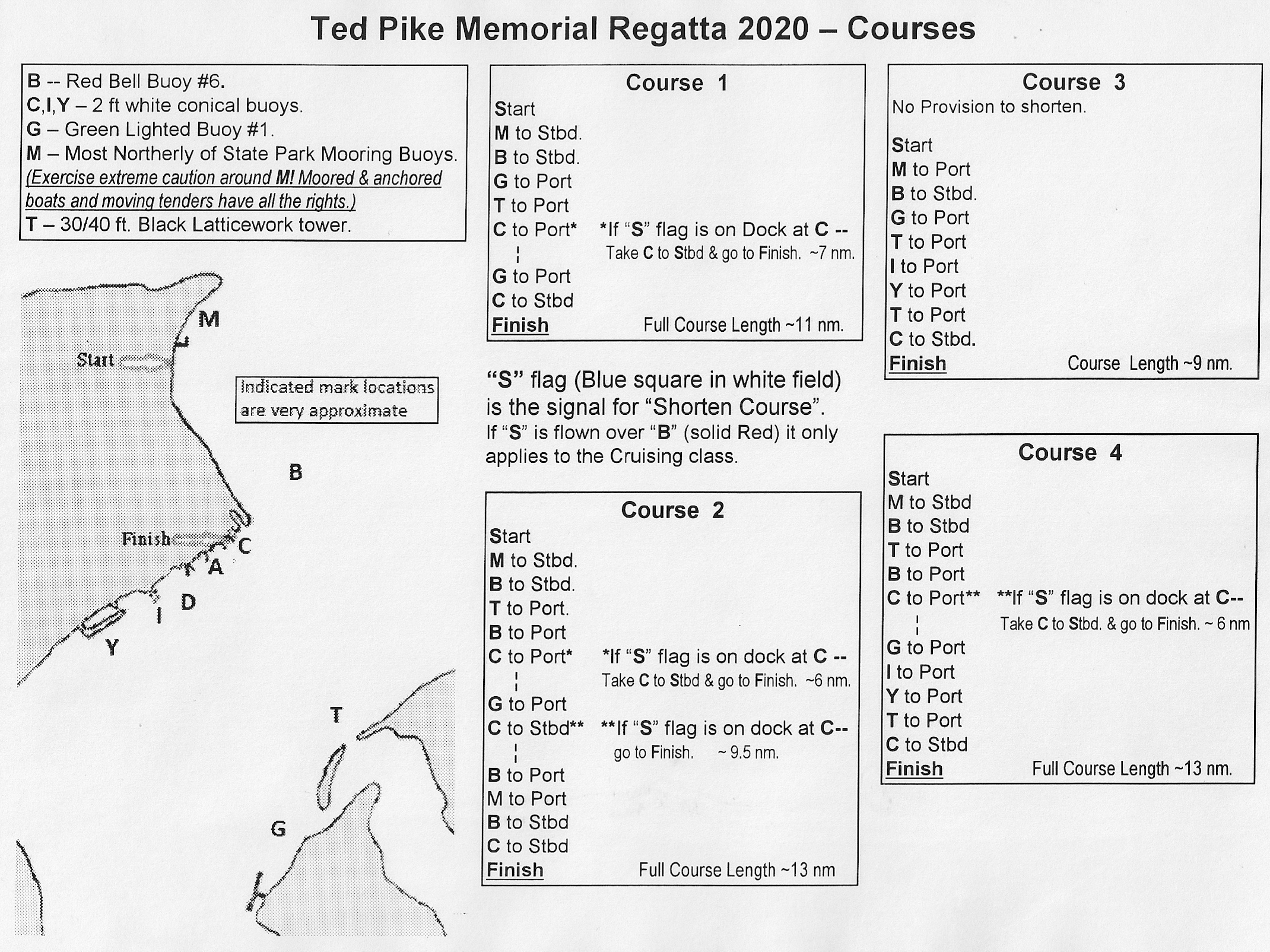 A printable PDF of the SIs is at Ted Pike Memorial Regatta Instructions 2020REV