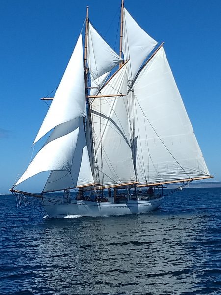 There was a very light northerly wind in the starting area so the course selected was #2 (SMTBCGCMCF – 13nm., with possible shortening at 6 nm, & 9.5 nm.). This proved to be a good choice. The wind began to fill in after rounding M, softened again in the Bay when approaching T, then settled down to a variable 8 – 12 kt. breeze for the rest of the race. This was a close race, after three hours of racing most boats finished within twenty five minutes.