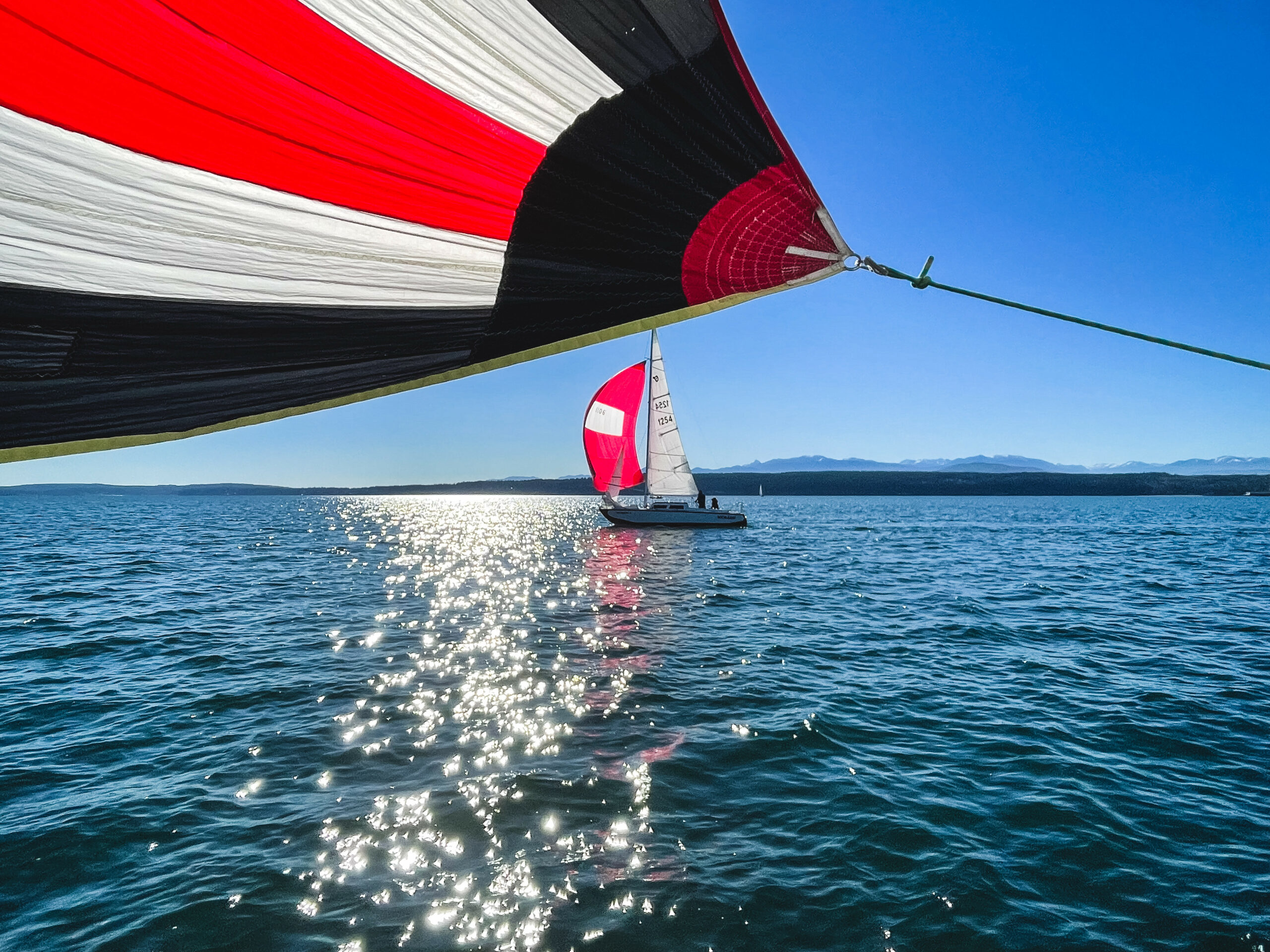 Sun, wind, and fairly warm out, it was the best sailing of the winter so far. Five Tbirds had two races of two laps each. The wind was shifting from W to NW at around 5 to 8 knots. Falcon took the first race by a whisker over the double handed Kolus. Owl won the second race by a couple of boat-lengths over Kuma San. Is spring in the air?