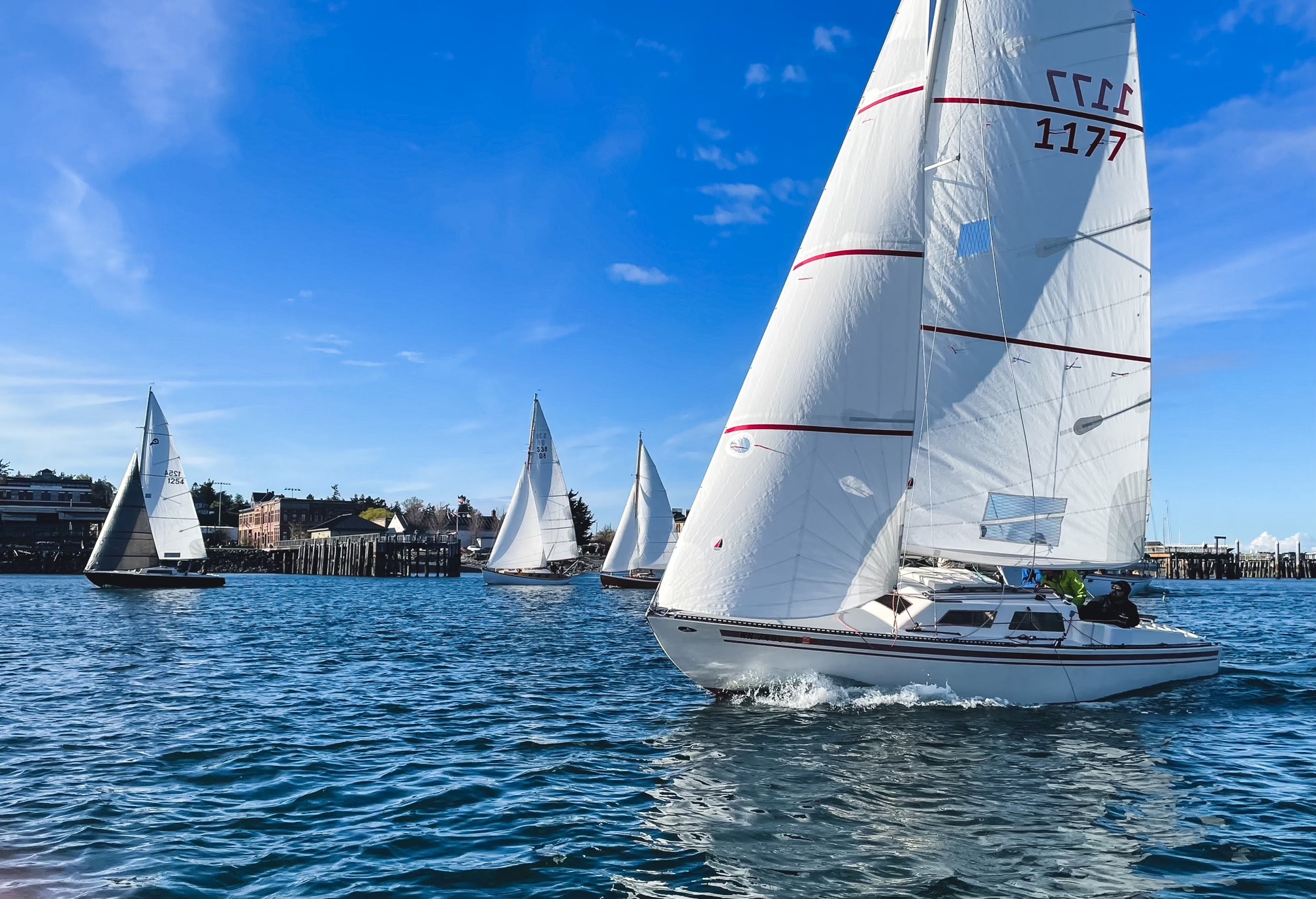 The wind was around eight knots gusting up to fifteen from the WSW, with no big wind shifts. Nine boats showed up to start the race. It was quite a nice evening, almost warm. The course went from city dock to the I mark, then to the tower and back to the I mark, then out to the red Pt. Hudson buoy, then finish at city dock. The wind was perfect for a nice windward/leeward leg between I and the tower. Pacifica, fourth at the tower, came back strong for the second rounding of I in first, followed by Kuma San, Falcon, and Corvo. And that was the finish order. An unregistered ketch was next, then Varya, Cito, and Murrelet. Final, corrected-time results will be posted as soon as all boats have reported in or the time limit for posting results has passed.