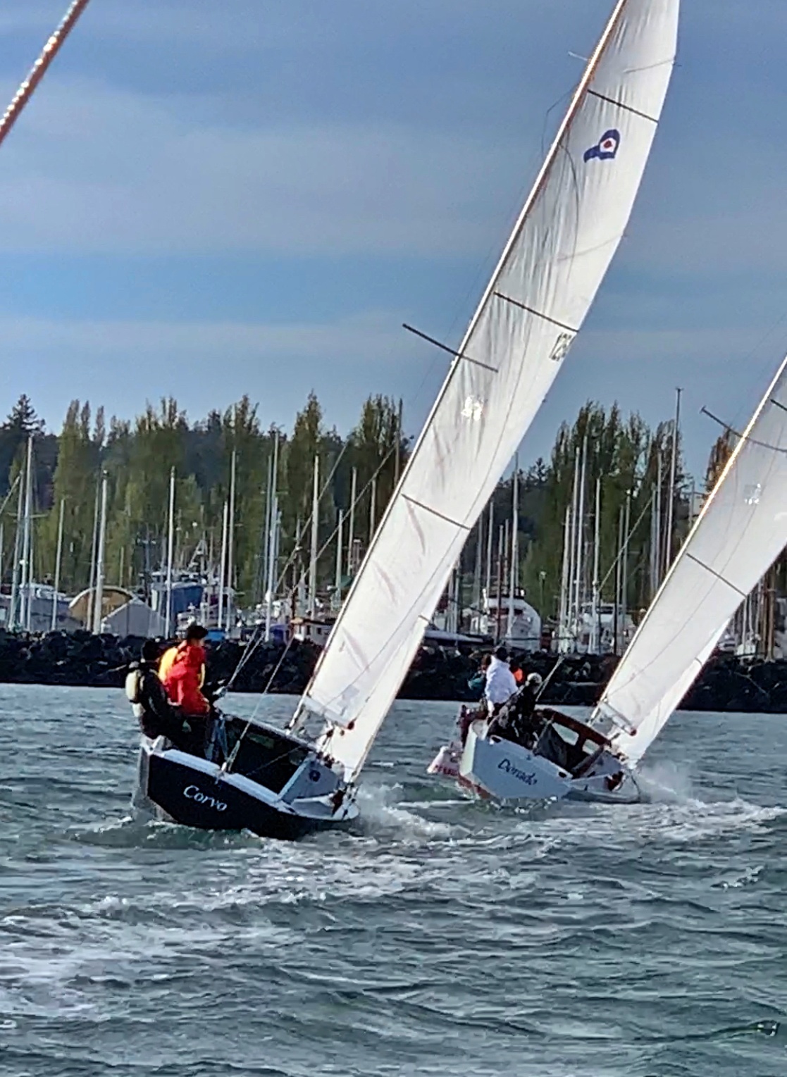 It was windy. Twenty, gusting to thirty. “Should we race?”, was the question. After a bunch of discussion and feet shuffling, the answer was yes. Apparently the previous week’s cancellation due to excessive wind had caused a pent up demand to get out on the water. The first race was a knuckle-biting affair in which none of the boats chose to fly their kites. It was two laps around a short course from out in the bay to the Y mark and back to the committee boat. The second race saw the wind drop to a more reasonable level. Owl had a man-overboard when one of the hiking straps parted and the crew member went over backwards into the bay. Good seamanship and quick thinking by the Owl crew resulted in a quick retrieval. The unfortunate swimmer, upon being hoisted back onto the boat was still game to continue and Owl finished the race. Falcon saw a rip in their jib, Corvo lost a batten, otherwise not too much carnage on a frisky evening of racing.