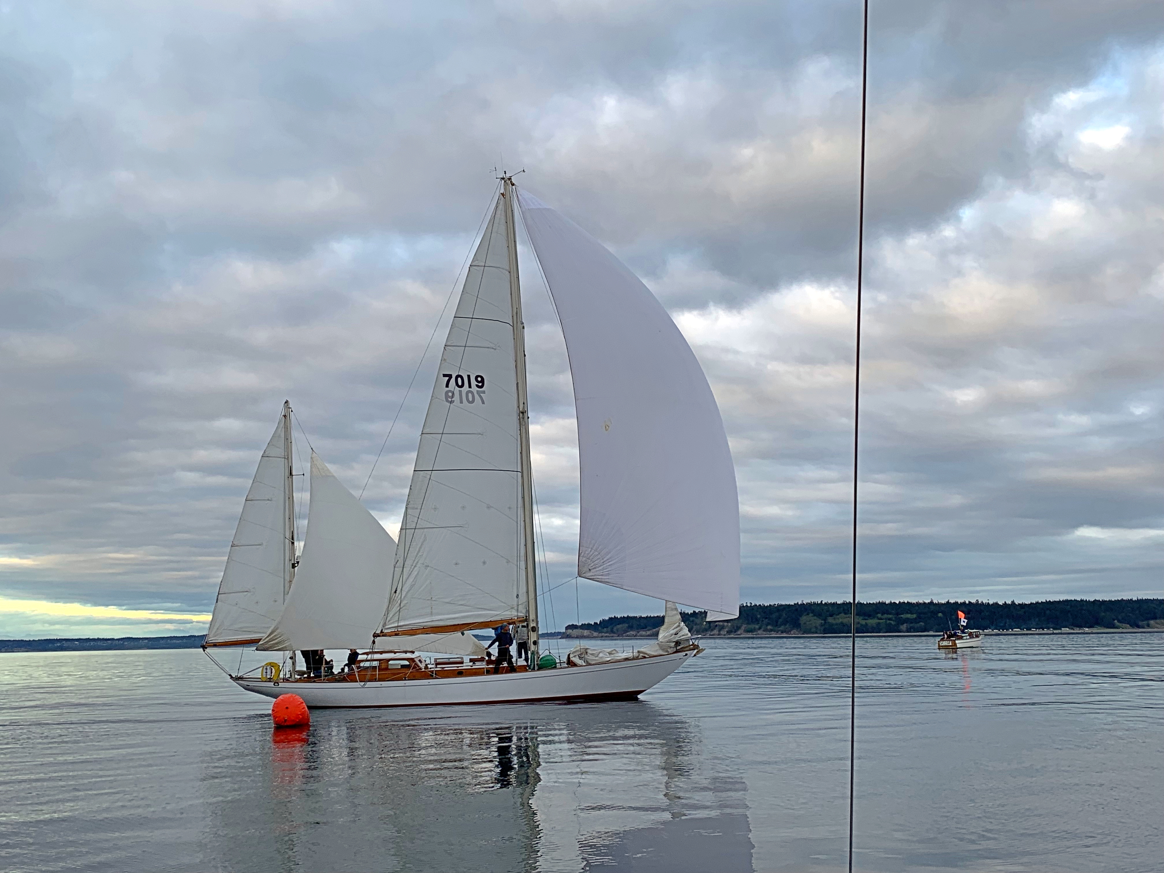 With very little wind at the start Falcon drifted across the line early and paid the price trying to get back. Kuma San and Pacifica played it more conservative and made it out to the breeze by Pt. Hudson. Then it was pretty good wind out to Ft. Warden and back to City Dock. Pacifica started out slowly, but as the wind picked up so did she, finally passing Kuma San on the way back near Pt. Hudson.