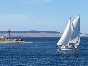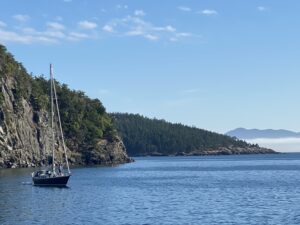 The sun soon turned Admiralty Inlet grey into eastern Juan De Fuca Straight tropical indigo. Sharp lookouts and push ups worked as Puffin bested Erin’s crossing to Watmough Bay by a couple of hours.