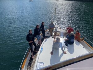David Burrows started the fleet at City Dock promptly at 10:00 a.m. on Saturday. The wind was light, with high overcast and some fog. Helena Cooper assumed a sharp lookout position at the bow, while brother Xavier prepared for more wind ahead by doing push-ups on the foredeck.
