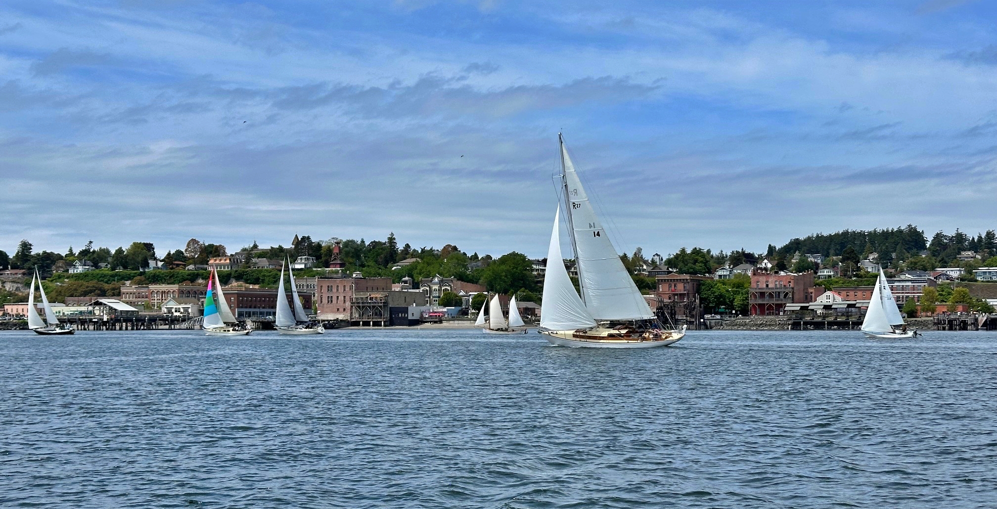It was a wonderful tight reach along the city front from “C” to “Y” and the fleet started to open up a bit. Salsa came back around to check on a couple of boats that appeared to be having some challenges and then re-joined the fleet as everyone was trying to optimize their VMG down to “G” as the wind held steady from the NW around 6-8 knots. From “G”, we had a nice beat up to “I”, our ending point. About halfway up the leg, the wind shut down. Salsa was ready to fire up the motor when the crew noticed wind filling in from the east. Those boats that stayed on port tack longer were the first to get this northeasterly wind of about 8 knots. Salsa headed up way above proper course to get some of that new wind.