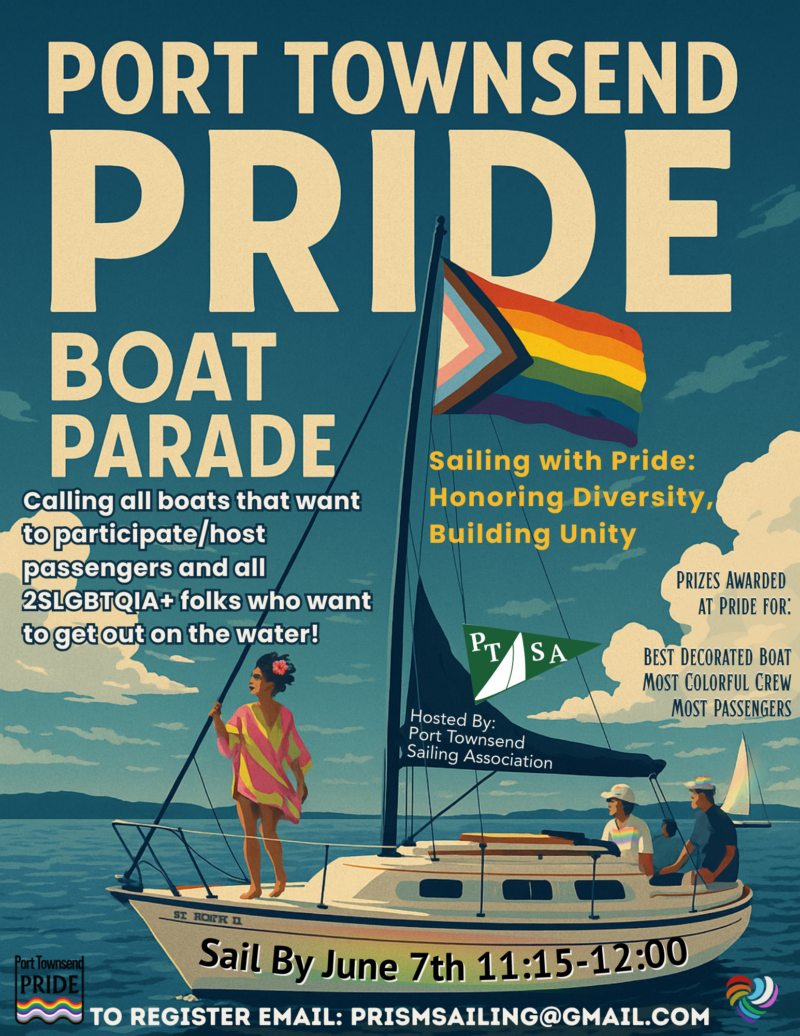 Please join the PTSA, the Production Alliance and Prism Sailing as we celebrate PT Pride on the water! Get your boats and your friends together for a Parade and Sail By along the Port Townsend Waterfront as the Pride Festival kicks off at Pope Marine Park. All are welcome as we celebrate and support our diverse and joyful community together!