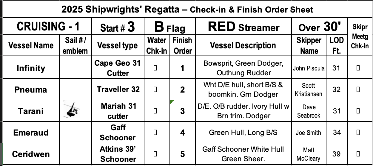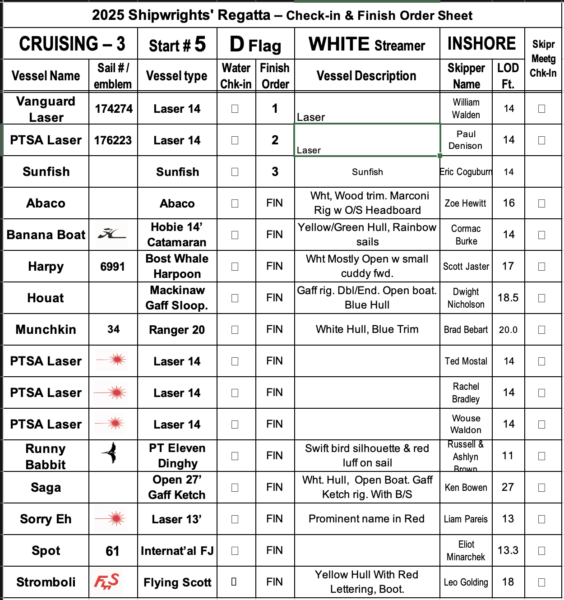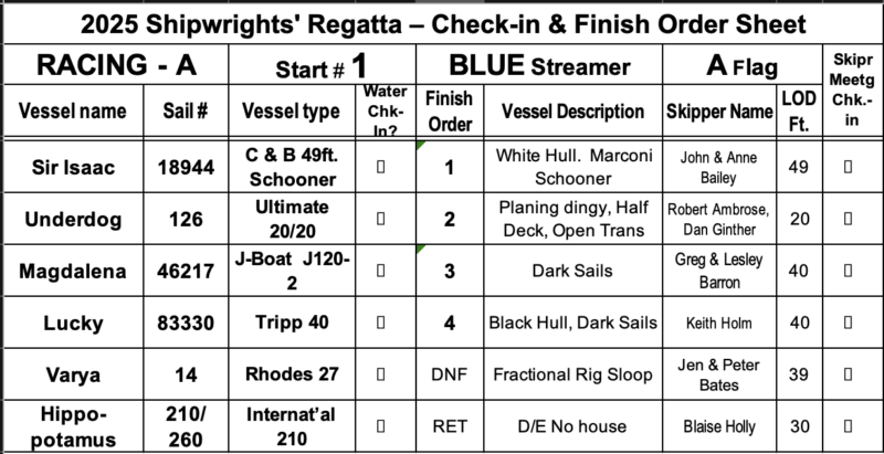- The Peg-Leg for first in the racing class went to SIR ISAAC (5 time winner of the Shipwrights Regatta)
